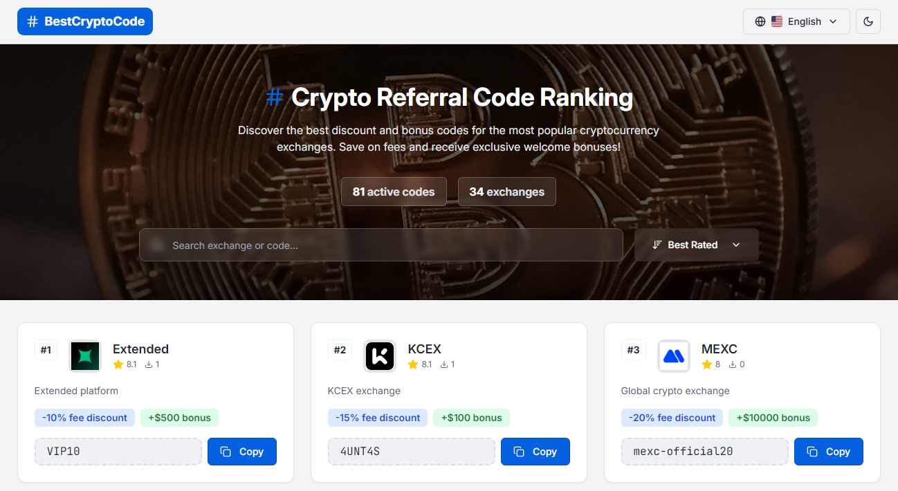 BestCryptoCode.com is a website that brings together the best referral and promotional codes for cryptocurrency exchanges in one place. It allows users to access attractive sign-up bonuses, trading fee discounts, and exclusive welcome offers on popular crypto platforms. The site is regularly updated to ensure that all listed codes are current and provide real value. BestCryptoCode.com is a useful resource for both beginners and experienced traders looking to get the most out of crypto exchange promotions.
