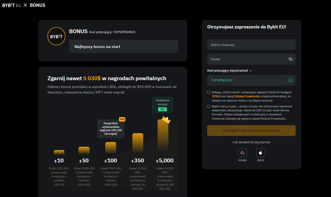 Dołącz do Bybit EU z kodem promocyjnym TOPVIPBONUS już dziś i odkryj świat ekskluzywnych nagród o łącznej wartości nawet 5030 USD! Czekają na Ciebie bonusy...