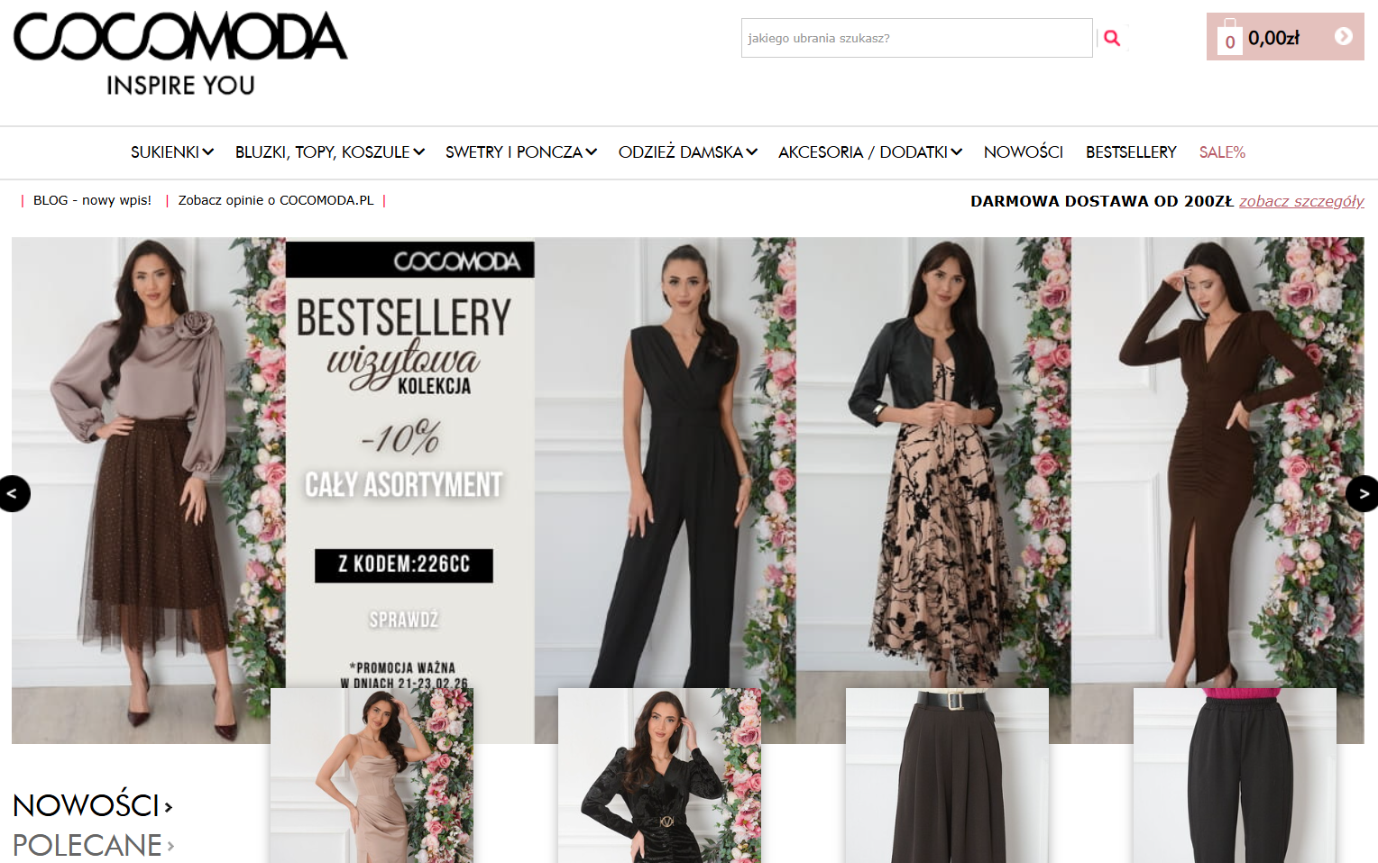 Cocomoda to popularny butik internetowy, który stał się prawdziwą inspiracją dla kobiet poszukujących najgorętszych trendów prosto z wybiegów w przystępnych cenach. Sklep ten słynie z niezwykle kobiecych kolekcji, które idealnie łączą elegancję z nutą nowoczesnego stylu, oferując szeroki wybór od sukienek wizytowych, przez stylowe komplety dresowe, aż po unikalne okrycia wierzchnie. Platforma regularnie odświeża swój asortyment, dostarczając ubrania, które pozwalają czuć się wyjątkowo i pewnie siebie w każdej sytuacji – zarówno podczas wielkiego wyjścia, jak i w codziennym, miejskim looku. Dzięki dbałości o estetykę prezentowanych produktów oraz sprawnej obsłudze, butik ten zdobył szerokie grono lojalnych klientek, które cenią sobie modny wygląd bez konieczności wydawania fortuny.