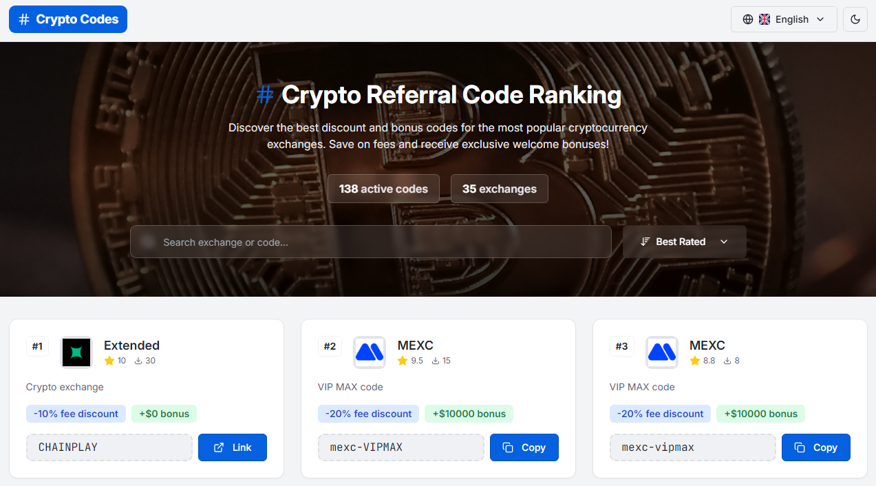 CryptoCodes.app is a website that brings together the best referral and promotional codes for cryptocurrency exchanges in one place. It allows users to access attractive sign-up bonuses, trading fee discounts, and exclusive welcome offers on popular crypto platforms. The site is regularly updated to ensure that all listed codes are current and provide real value. CryptoCodes.app is a useful resource for both beginners and experienced traders looking to get the most out of crypto exchange promotions.