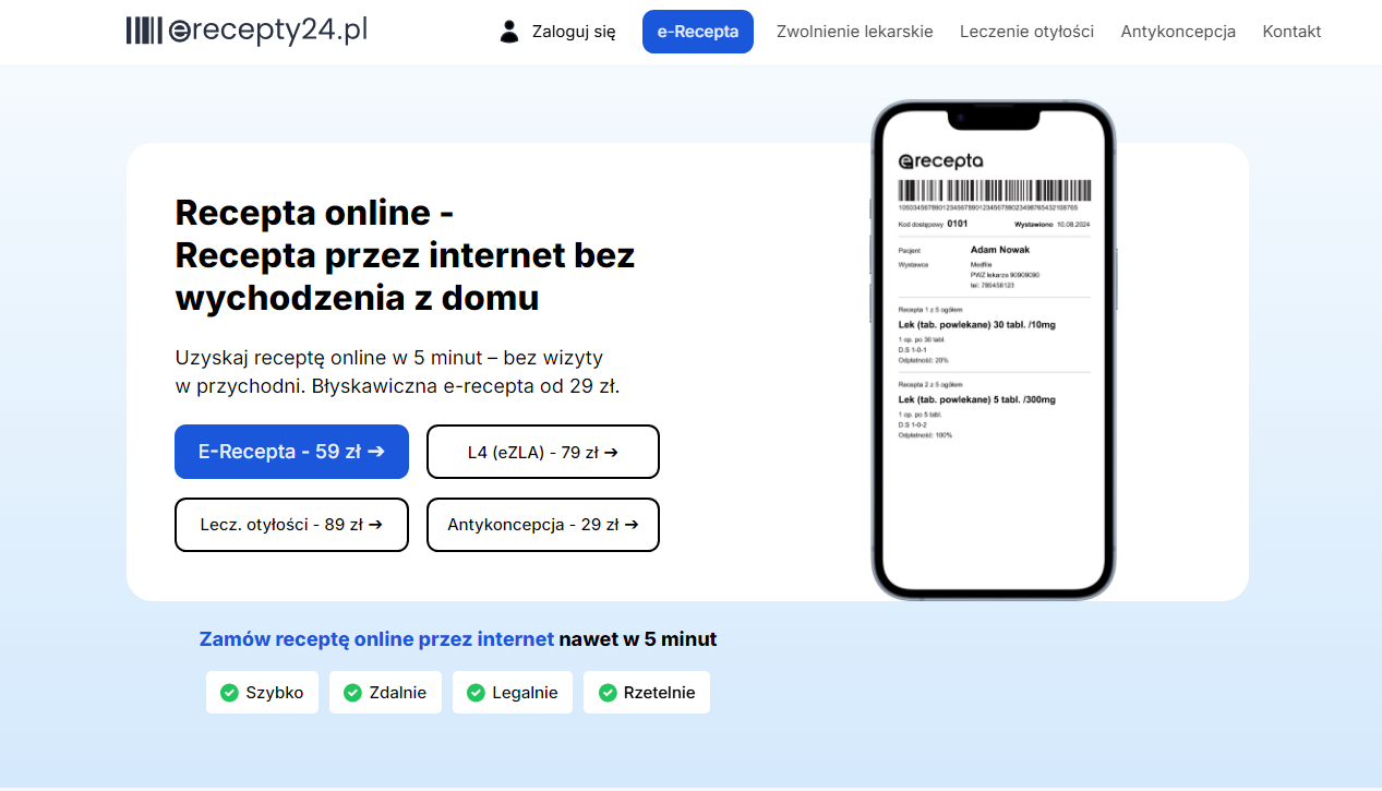 Erecepty24 to serwis, który pozwala w prosty sposób uzyskać receptę online, bez kolejek i osobistych wizyt u lekarza. Cały proces odbywa się zdalnie, co zapewnia wygodę i oszczędność czasu dla pacjentów.