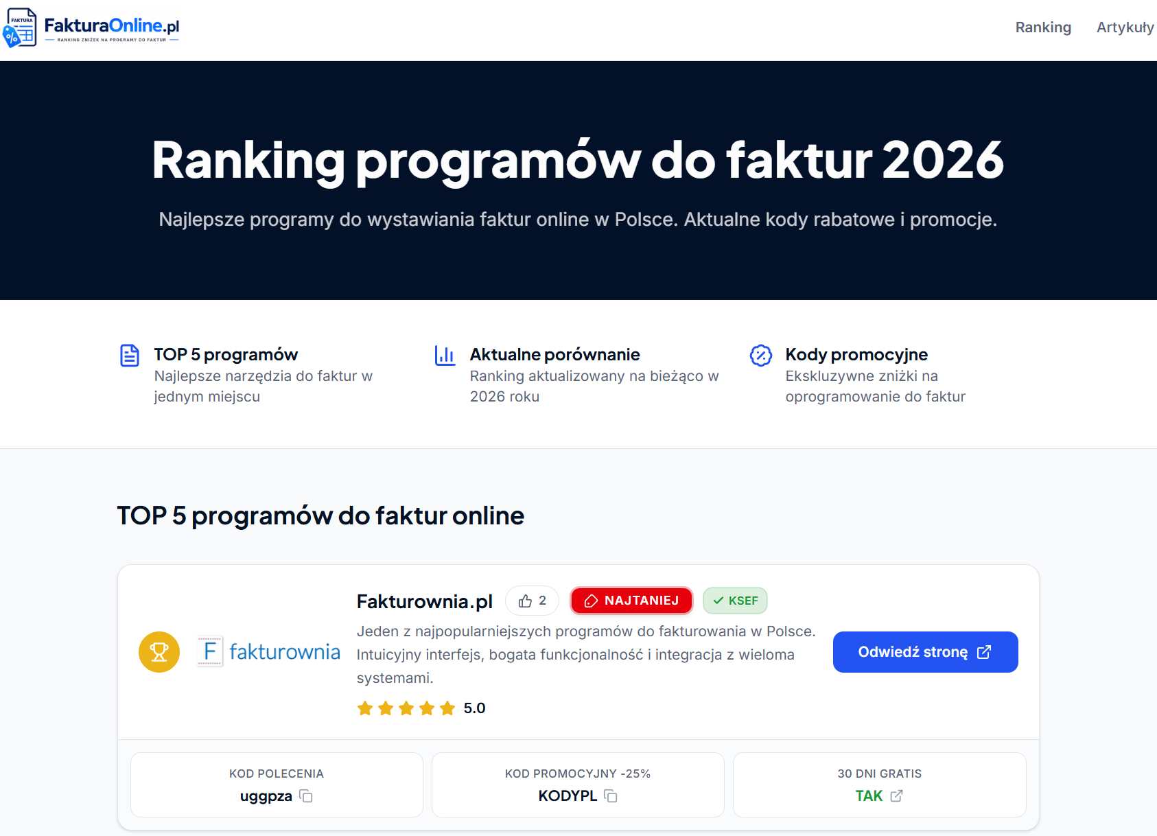 Ranking Faktura Online stanowi rzetelne zestawienie najlepszych narzędzi do fakturowania, które pozwala zaoszczędzić czas na poszukiwaniach, a w połączeniu z kodami rabatowymi z Kody.pl gwarantuje najbardziej opłacalne wdrożenie wybranego oprogramowania w Twojej firmie.