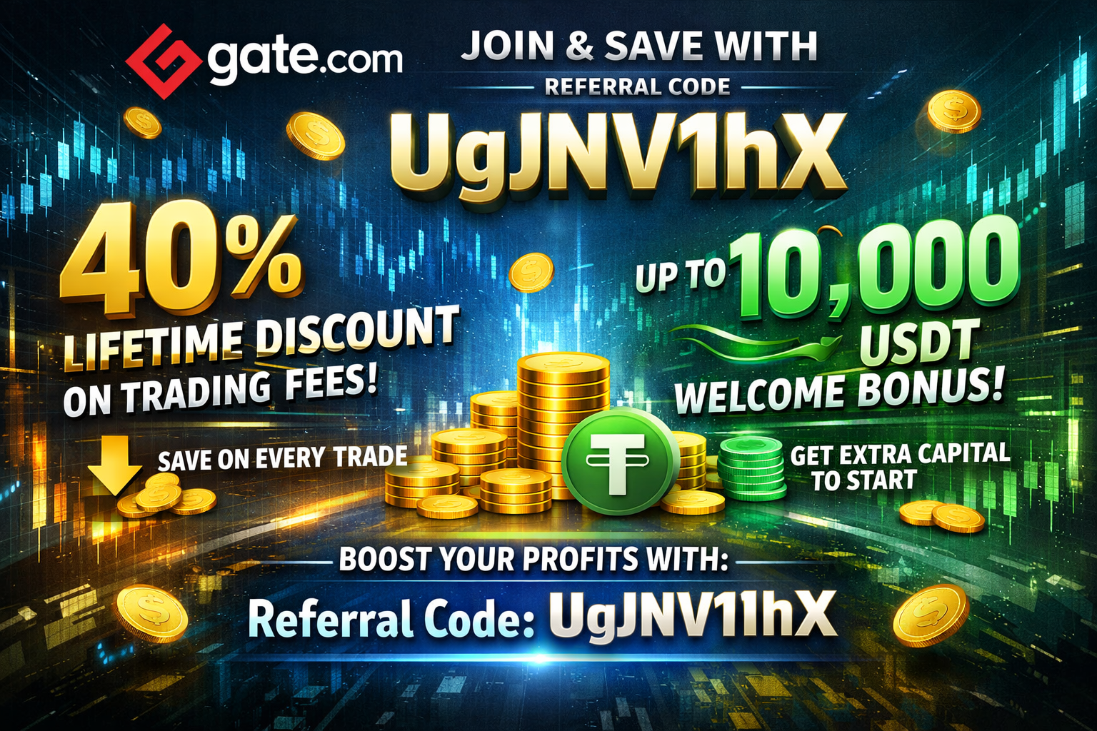 Using the Gate.com referral code UgJNV1hX gives new users a strong financial advantage right from the start. After registration, traders receive a 40% lifetime discount on all trading fees and commissions, which significantly lowers costs on spot and futures trading over time. On top of that, Gate.com offers welcome rewards of up to 10,000 USDT, unlocked through deposits, trading tasks, and promotional activities. This referral code is ideal for anyone who wants to trade on Gate.com with permanently reduced fees and a powerful bonus to boost their initial capital.