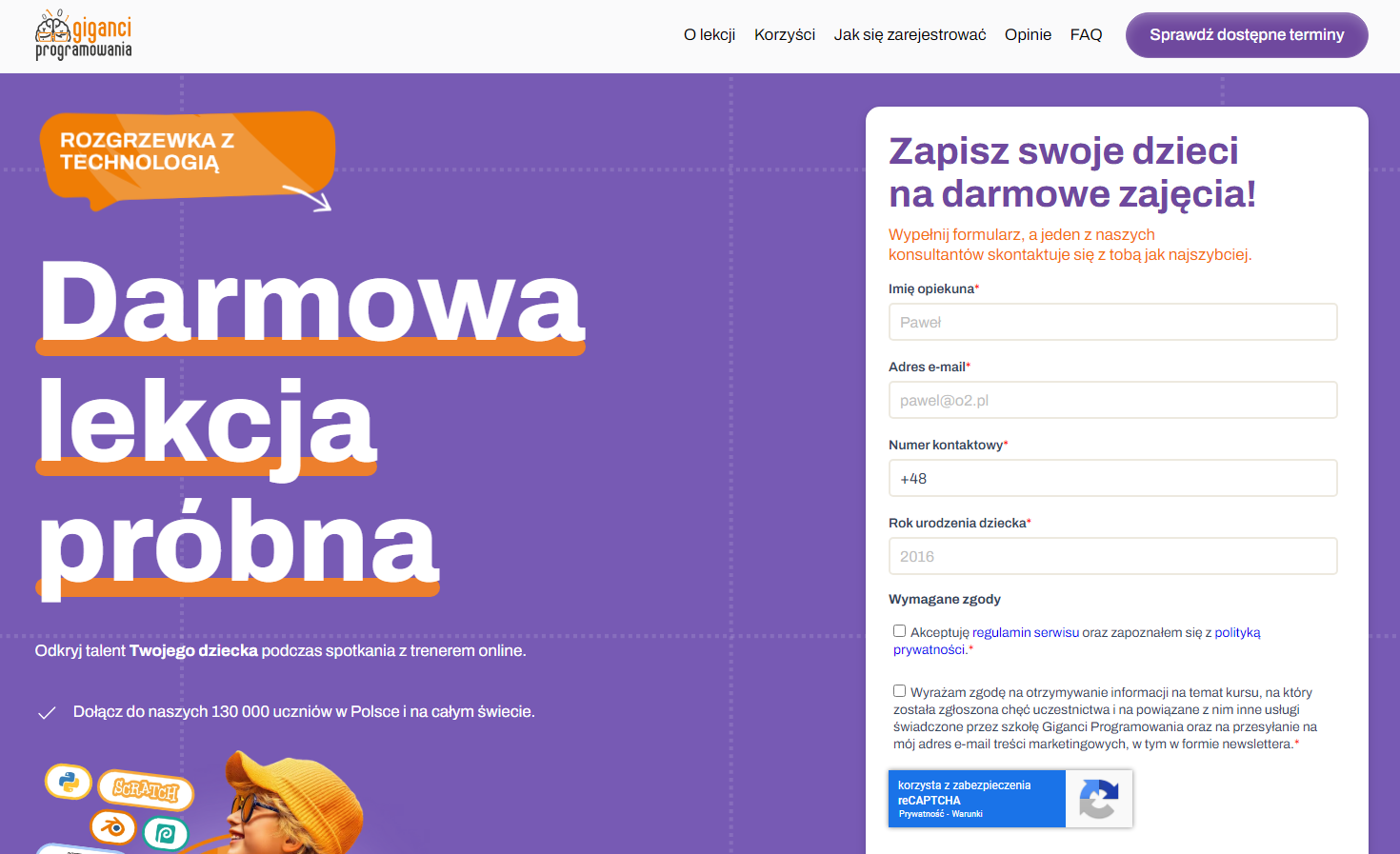 Darmowa lekcja próbna. Odkryj talent Twojego dziecka podczas spotkania z trenerem online. Dołącz do naszych 130 000 uczniów w Polsce i na całym świecie. Jak będzie wyglądać lekcja?Twoje dziecko weźmie udział w 60min. lekcji z wykwalifikowanym trenerem oraz ekspertem od kursów programowania. Dzięki wspólnym projektom i interaktywnym ćwiczeniom bazującym m.in. na jego zainteresowaniach otrzymasz spersonalizowane rekomendacje oraz propozycję planu nauki dla Twojego dziecka.