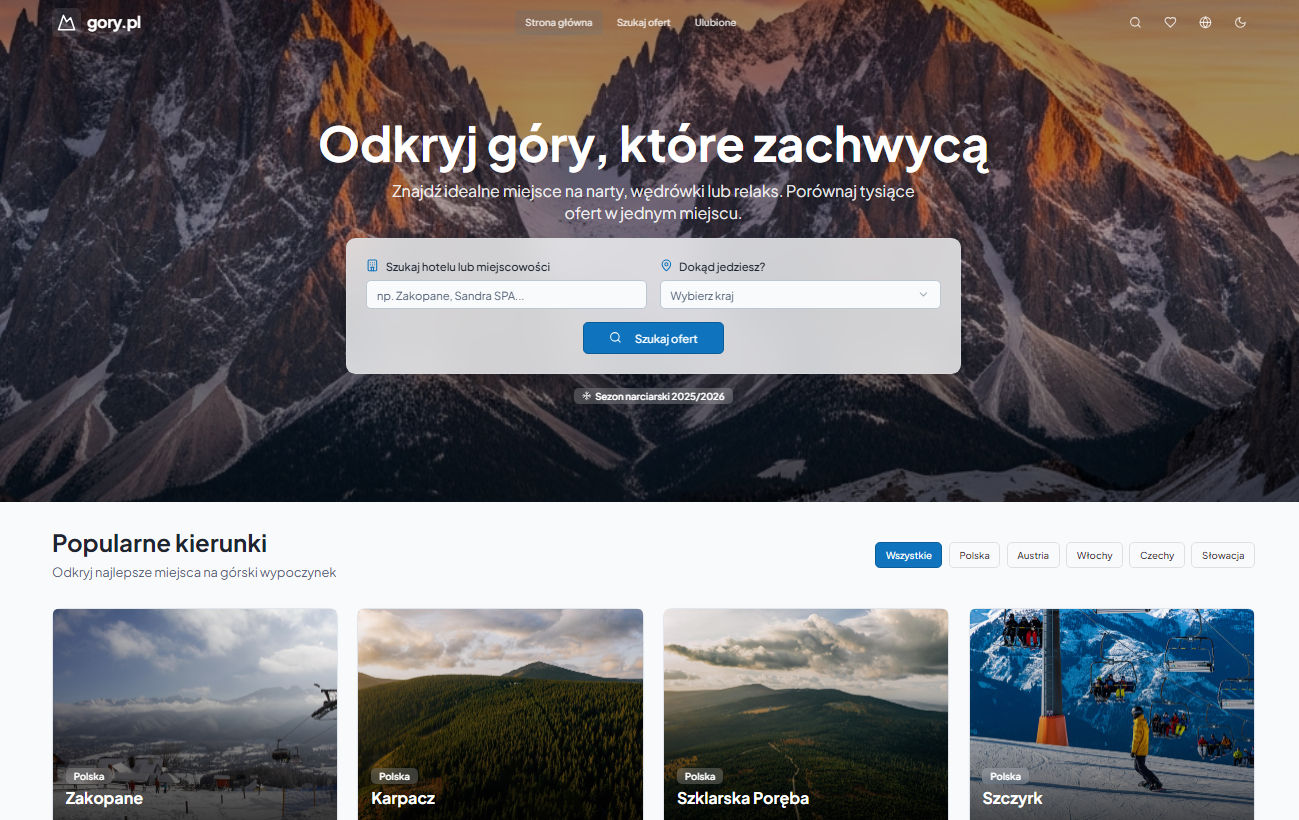 Gory.pl to portal turystyczny skupiony na ofertach noclegów, wyjazdów i promocji w górach w Polsce oraz za granicą. Serwis zbiera aktualne okazje cenowe, hotele, pobyty SPA i pakiety wypoczynkowe w jednym miejscu, ułatwiając planowanie wyjazdu. Dzięki przejrzystej formie i praktycznemu podejściu Gory.pl jest wygodnym narzędziem dla osób szukających gotowych propozycji wypoczynku w górach.