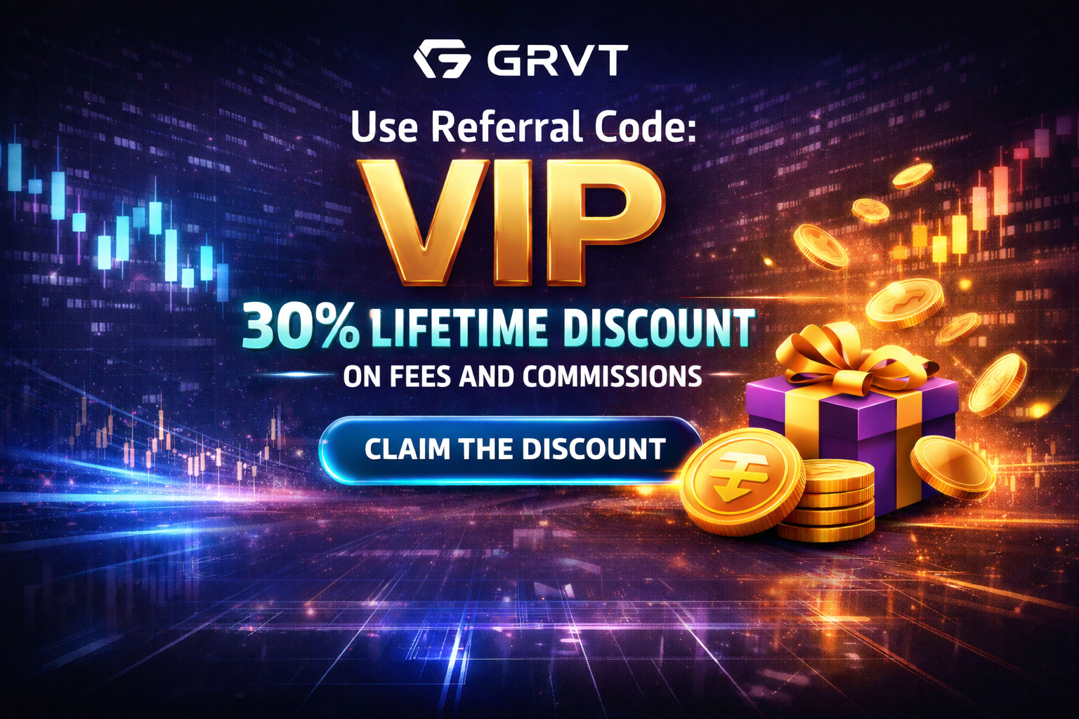 The referral code for GRVT is VIP, which gives you a 30% lifetime discount on trading fees and commissions.