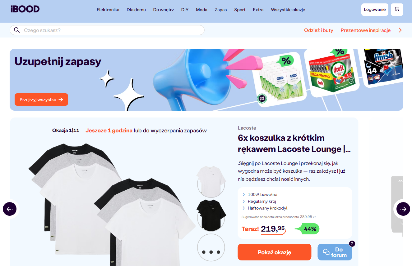 iBOOD to popularna platforma zakupowa specjalizująca się w ofertach typu „deal of the day”, gdzie każdego dnia pojawiają się nowe, mocno przecenione produkty. Serwis działa na zasadzie szybkiej sprzedaży ograniczonej czasowo, co sprawia, że użytkownicy mogą trafić na naprawdę atrakcyjne okazje z kategorii elektroniki, AGD, sportu, domu czy lifestyle’u. iBOOD wyróżnia się dużymi rabatami, szerokim asortymentem oraz dynamiczną formą zakupów, która przyciąga łowców promocji. Dzięki codziennej aktualizacji ofert użytkownicy mają szansę kupić markowe produkty w cenach znacznie niższych niż rynkowe, co czyni platformę jednym z najciekawszych miejsc do polowania na okazje w internecie.
