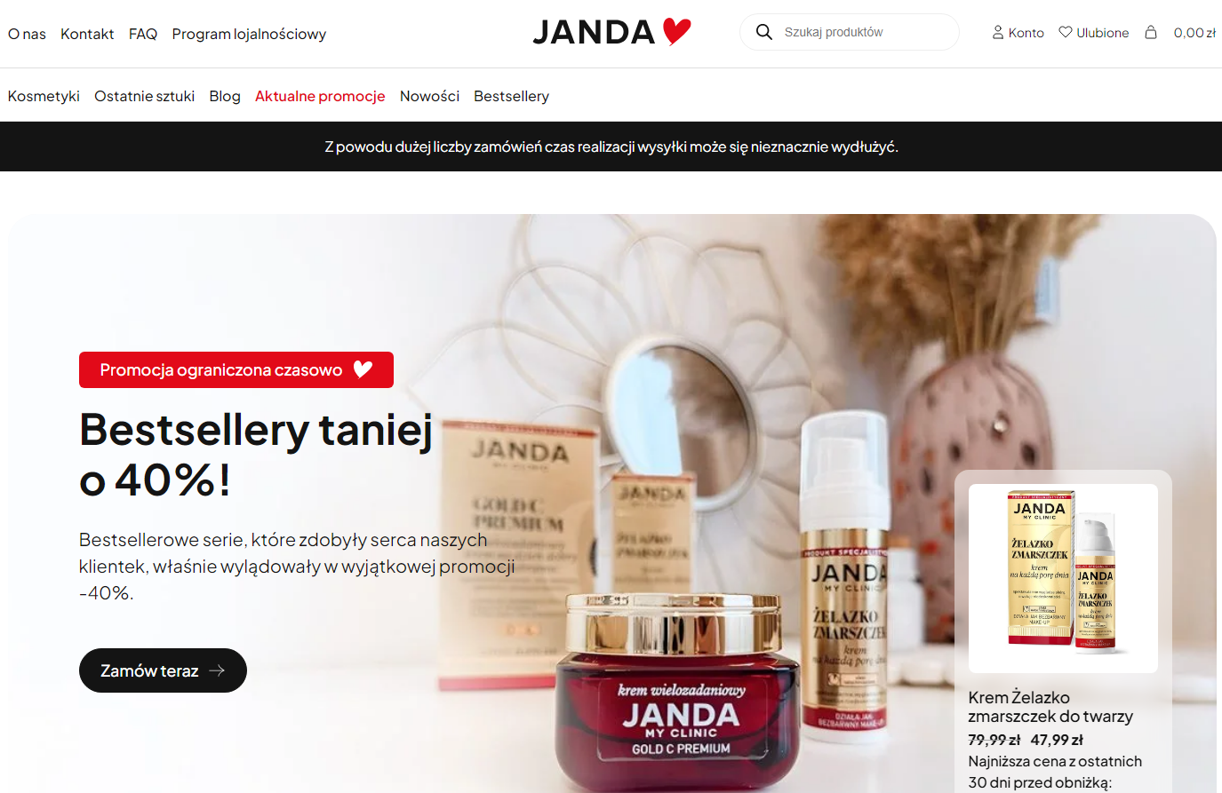 Sklep internetowy Janda.pl to miejsce, w którym luksusowa pielęgnacja staje się dostępna na wyciągnięcie ręki. Strona jest przejrzysta i łatwa w obsłudze, a każdy produkt dokładnie opisany – z informacjami o działaniu, składnikach i sposobie użycia. Co ważne, marka dba o komfort swoich klientów, oferując darmową dostawę od 120 zł, co czyni zakupy jeszcze bardziej opłacalnymi. Dzięki temu można spokojnie dobrać ulubione produkty, skorzystać z promocji i nie płacić za wysyłkę.