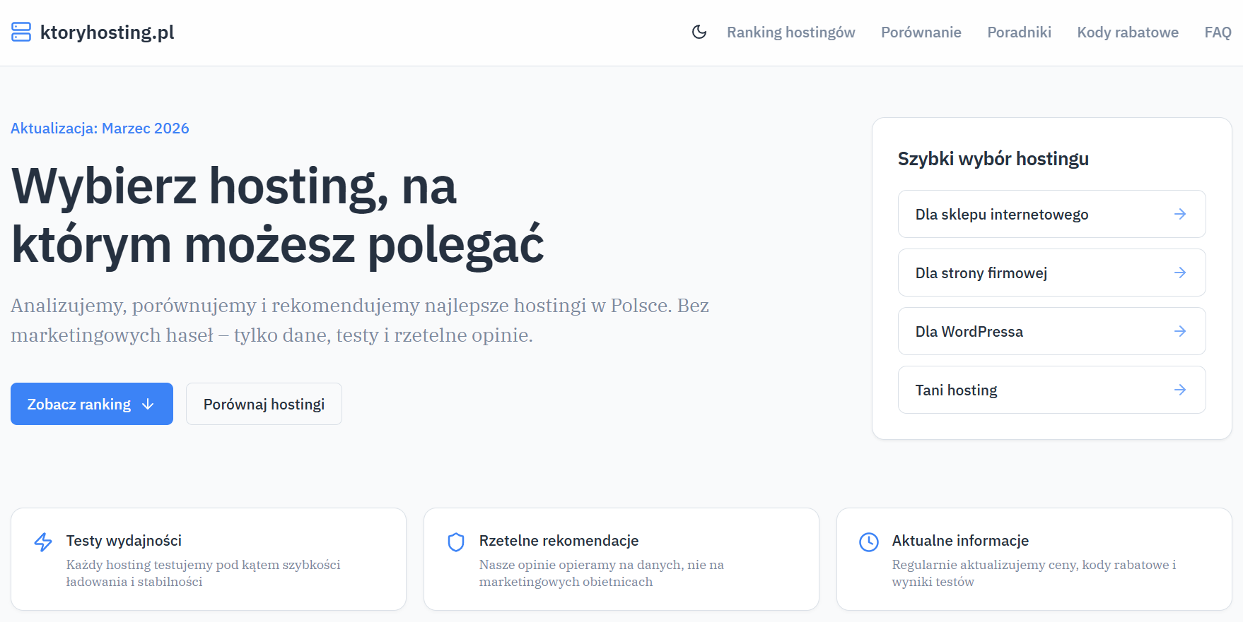 Portal Który Hosting to specjalistyczny serwis poświęcony rzetelnemu porównywaniu usług serwerowych, stworzony z myślą o osobach szukających optymalnego miejsca na swoje strony WWW. Platforma publikuje regularnie aktualizowane rankingi, w których szczegółowej analizie poddawane są kluczowe parametry, takie jak szybkość działania, stabilność łącza, jakość wsparcia technicznego oraz stosunek ceny do oferowanych możliwości. Dzięki obiektywnym testom i przejrzystym zestawieniom, użytkownicy mogą łatwo porównać oferty najpopularniejszych dostawców w Polsce, co znacznie ułatwia podjęcie świadomej decyzji o wyborze hostingu dopasowanego do konkretnych potrzeb projektu. Serwis stanowi cenne źródło wiedzy zarówno dla początkujących twórców stron, jak i profesjonalistów, którzy cenią sobie konkretne dane techniczne i sprawdzone opinie o infrastrukturze serwerowej.