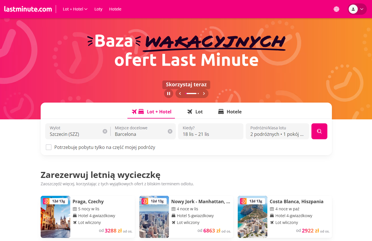 Opcja Lot + Hotel na Lastminute.com to super wygodne rozwiązanie dla osób, które chcą zorganizować cały wyjazd w jednym miejscu. ✈️🏨 Serwis pozwala jednocześnie zarezerwować przelot oraz nocleg, co często wychodzi dużo taniej niż kupowanie wszystkiego osobno. Do tego dochodzą częste promocje, zniżki i rabaty, dzięki którym można upolować naprawdę świetne okazje – zwłaszcza na spontaniczne wyjazdy. Dużym plusem jest też szeroka dostępność kierunków — od europejskich stolic po egzotyczne wakacje all inclusive. Wystarczy wybrać termin, miejsce wylotu i preferencje dotyczące hotelu, a Lastminute.com podpowie gotowe pakiety dopasowane do budżetu i oczekiwań. Idealne dla osób, które chcą po prostu lecieć i odpocząć, bez stresu planowania każdego detalu! 🏝️✨
