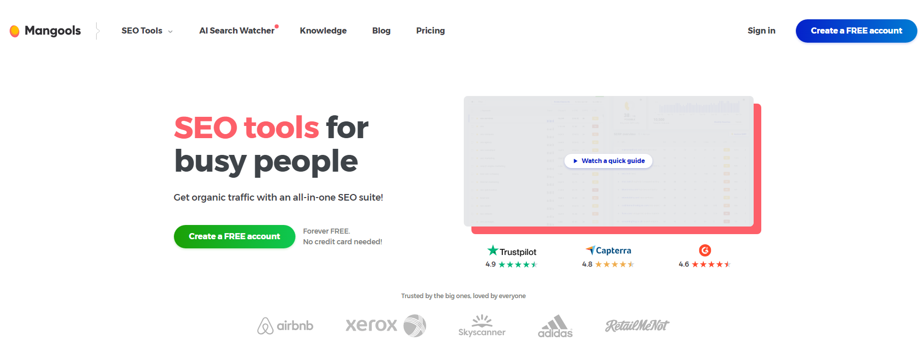 Mangools to przystępny i intuicyjny zestaw narzędzi SEO, który pomaga szybko podejmować decyzje na podstawie konkretnych danych. Świetnie sprawdza się do doboru słów kluczowych, analizy konkurencji w SERP, monitoringu pozycji oraz ogólnego planowania treści bez zbędnego chaosu. Dużym plusem jest to, że można założyć darmowe konto i przetestować platformę, a później często da się znaleźć duże rabaty na płatne plany.