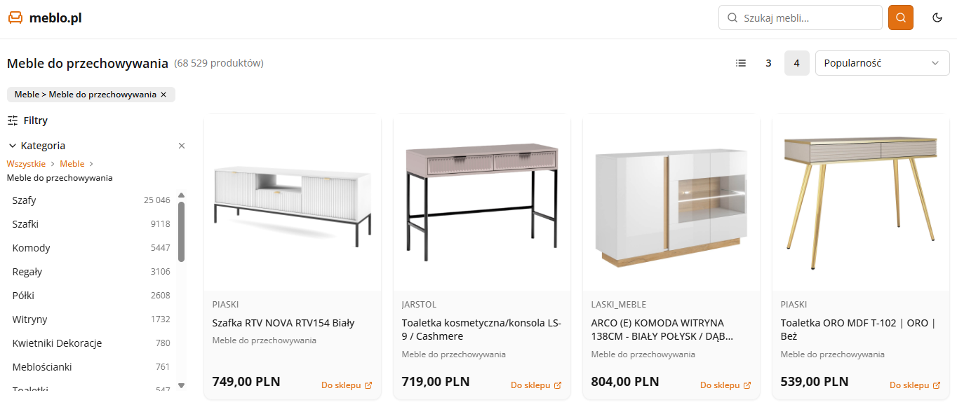 Meblo.pl to nowoczesna polska wyszukiwarka i agregator ofert, który gromadzi asortyment z setek sklepów meblowych w jednym miejscu. Zamiast przeglądać dziesiątki stron z osobna, użytkownik może tutaj błyskawicznie porównać ceny, style i wymiary produktów, korzystając z precyzyjnych filtrów. Serwis nie prowadzi bezpośredniej sprzedaży, lecz po wybraniu konkretnego mebla bezpiecznie przekierowuje na stronę sklepu partnerskiego w celu finalizacji zakupu.
