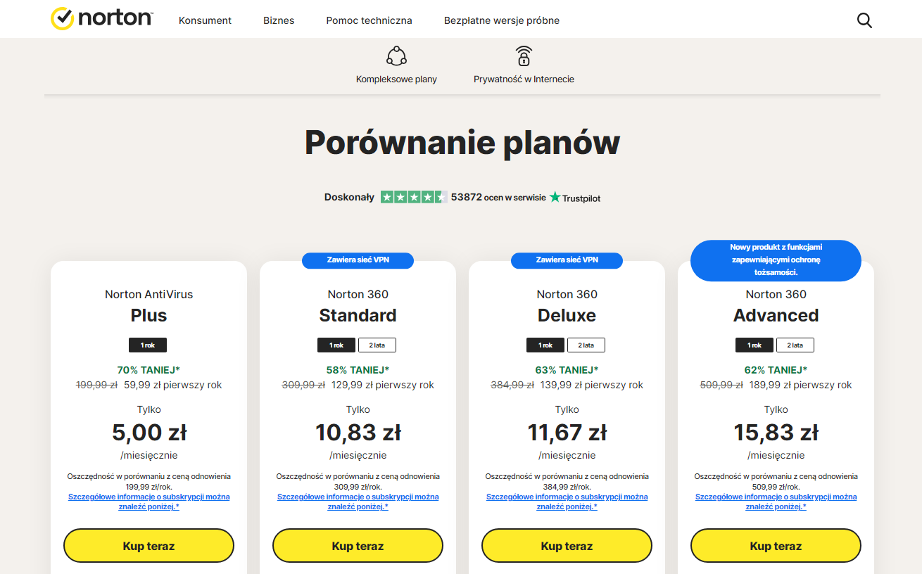Firma Norton regularnie udostępnia promocje na swoje produkty z zakresu cyberbezpieczeństwa, obejmujące zarówno rozwiązania dla użytkowników indywidualnych, jak i małych firm. W aktualnych ofertach można znaleźć atrakcyjne zniżki na pakiety z serii Norton 360, Norton AntiVirus Plus oraz Norton Secure VPN, które zapewniają kompleksową ochronę urządzeń i danych online. Promocje obejmują m.in. rabaty na roczne subskrypcje, bezpłatne okresy próbne oraz oferty łączone, pozwalające taniej korzystać z kilku funkcji w ramach jednego planu. Dzięki nim użytkownicy mogą w prosty sposób dobrać rozwiązanie dopasowane do swoich potrzeb — od podstawowej ochrony antywirusowej po zaawansowane zabezpieczenia prywatności, kopie zapasowe w chmurze i monitorowanie zagrożeń w sieci. Regularne sprawdzanie najnowszych promocji Norton to dobry sposób na utrzymanie wysokiego poziomu bezpieczeństwa przy jednoczesnej optymalizacji kosztów. Warto śledzić aktualne oferty, ponieważ zniżki często są ograniczone czasowo i obejmują najnowsze wersje oprogramowania z rozszerzonymi funkcjami ochrony.