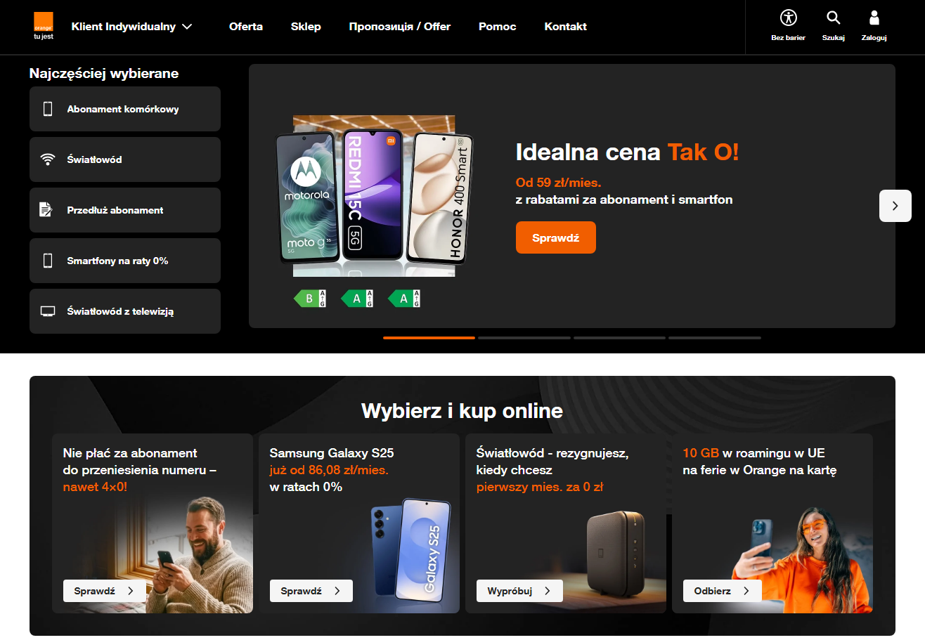 Orange to jedna z najpopularniejszych sieci telekomunikacyjnych w Polsce, ceniona za szeroki zasięg, stabilne usługi i nowoczesne rozwiązania dopasowane do różnych potrzeb klientów. Marka stawia na wygodę, innowacje i prostą obsługę, dzięki czemu korzystanie z jej oferty jest komfortowe na co dzień.