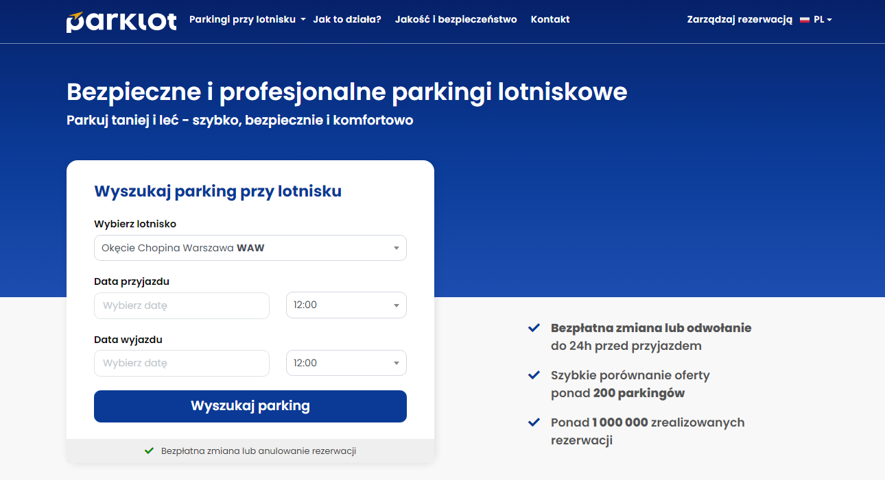 Bezpłatna zmiana lub odwołanie do 24h przed przyjazdem. Szybkie porównanie oferty - ponad 200 parkingów. Ponad 1 000 000 zrealizowanych rezerwacji. Utwardzone nawierzchnie, wyznaczone miejsca parkingowe, wygodne chodniki i wiaty dla oczekujących na przybycie busa, który dowiezie Państwa na terminal. Do tego bardzo niskie ceny parkowania, nawet 5zł za dobę! Tak wyglądają parkingi dla klientów sieci parkingów Parklot.