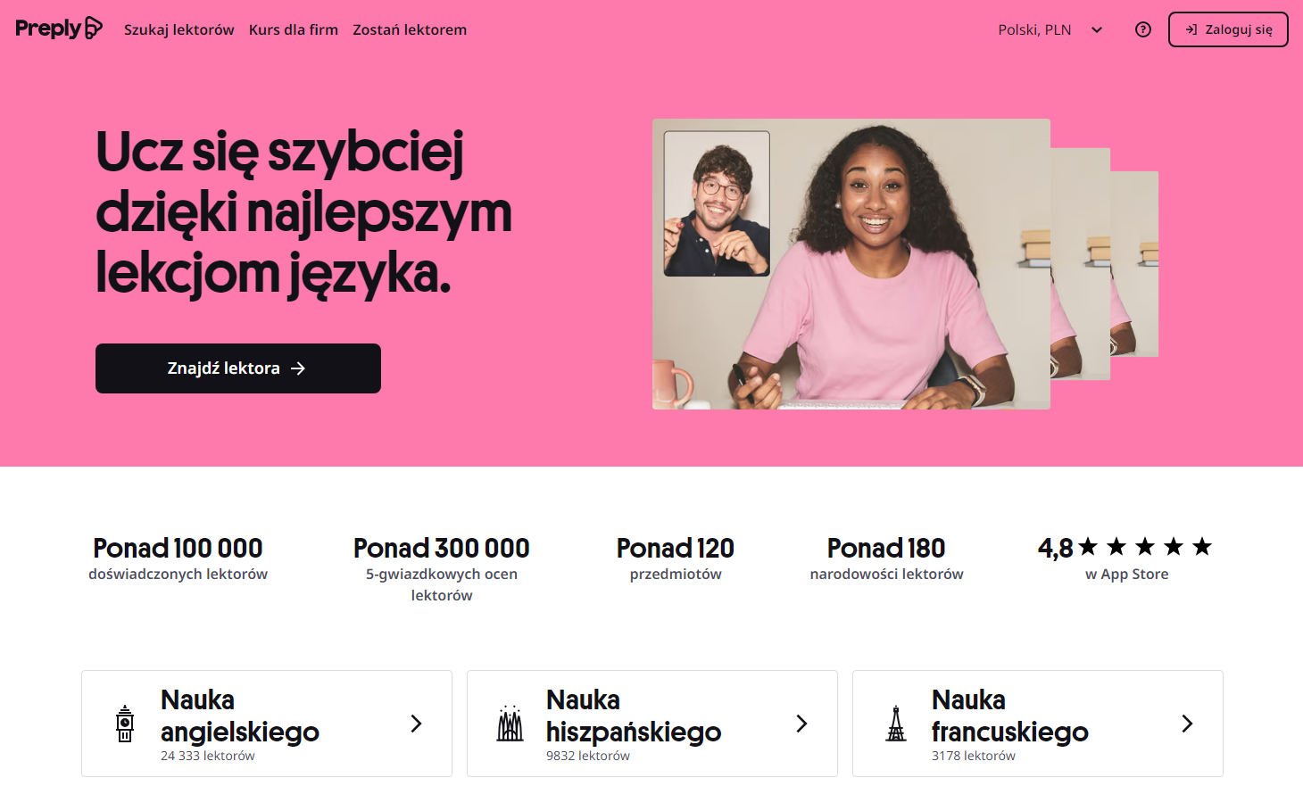Preply to platforma do nauki języków online, która łączy uczniów z lektorami z całego świata. Można tam znaleźć nauczycieli od angielskiego, niemieckiego, hiszpańskiego i wielu innych języków — również na różnym poziomie zaawansowania. Lekcje odbywają się przez wideorozmowy, a każdy może dobrać sobie odpowiedni styl nauki, godziny i cenę. To wygodna opcja dla osób, które chcą uczyć się z dowolnego miejsca i w swoim tempie.