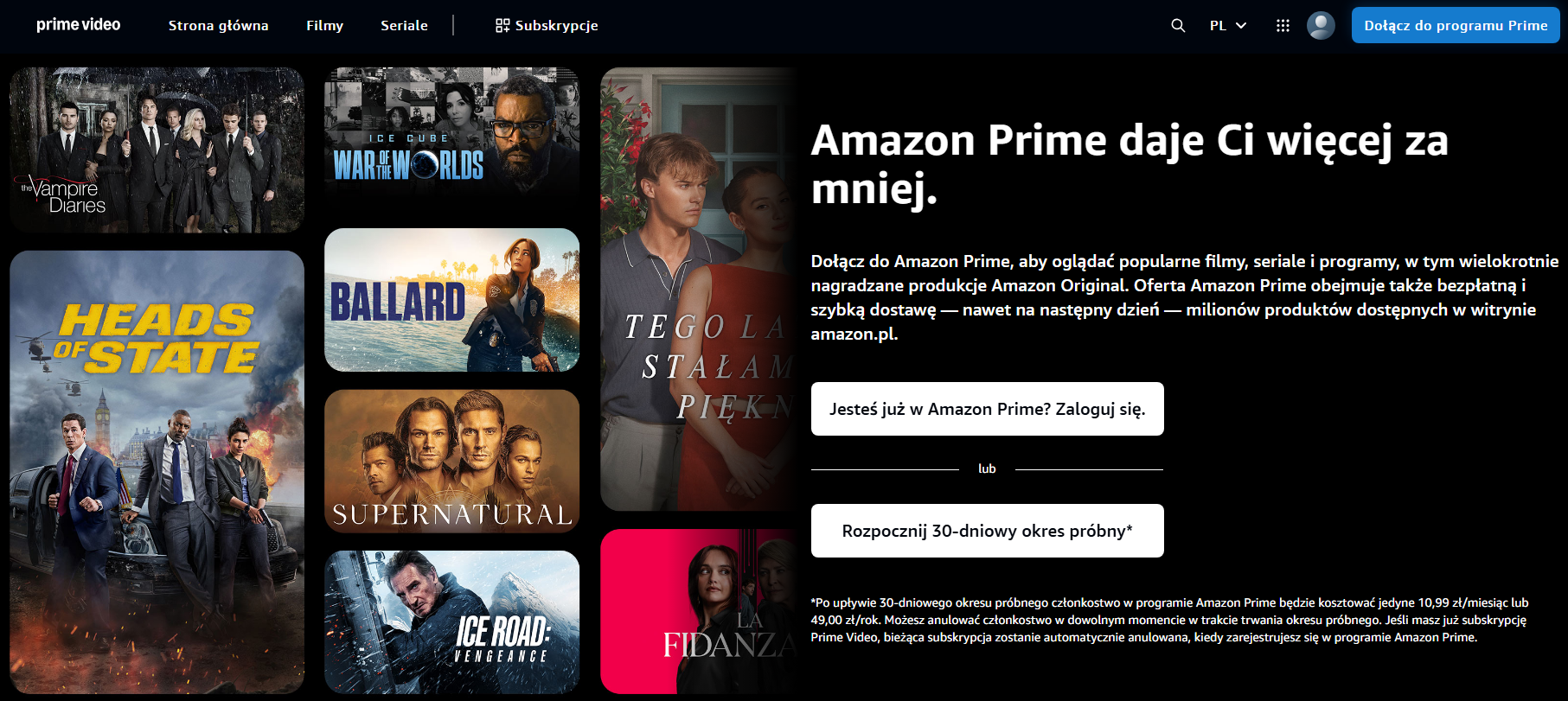 Dołącz do Amazon Prime, aby oglądać popularne filmy, seriale i programy, w tym wielokrotnie nagradzane produkcje Amazon Original. Oferta Amazon Prime obejmuje także bezpłatną i szybką dostawę — nawet na następny dzień — milionów produktów dostępnych w witrynie amazon.pl. Prime Video to platforma streamingowa od Amazona oferująca szeroką bibliotekę filmów i seriali, w tym nagrodzone produkcje oryginalne. Serwis zapewnia wysoką jakość obrazu, wygodny dostęp na wielu urządzeniach i możliwość pobierania treści offline. Wyróżnia się także atrakcyjnymi promocjami dla nowych oraz stałych użytkowników, często łącząc subskrypcję z dodatkowymi korzyściami Amazon Prime. Dzięki rosnącej liczbie nowości i personalizowanym rekomendacjom Prime Video staje się coraz ważniejszym graczem na globalnym rynku VOD.