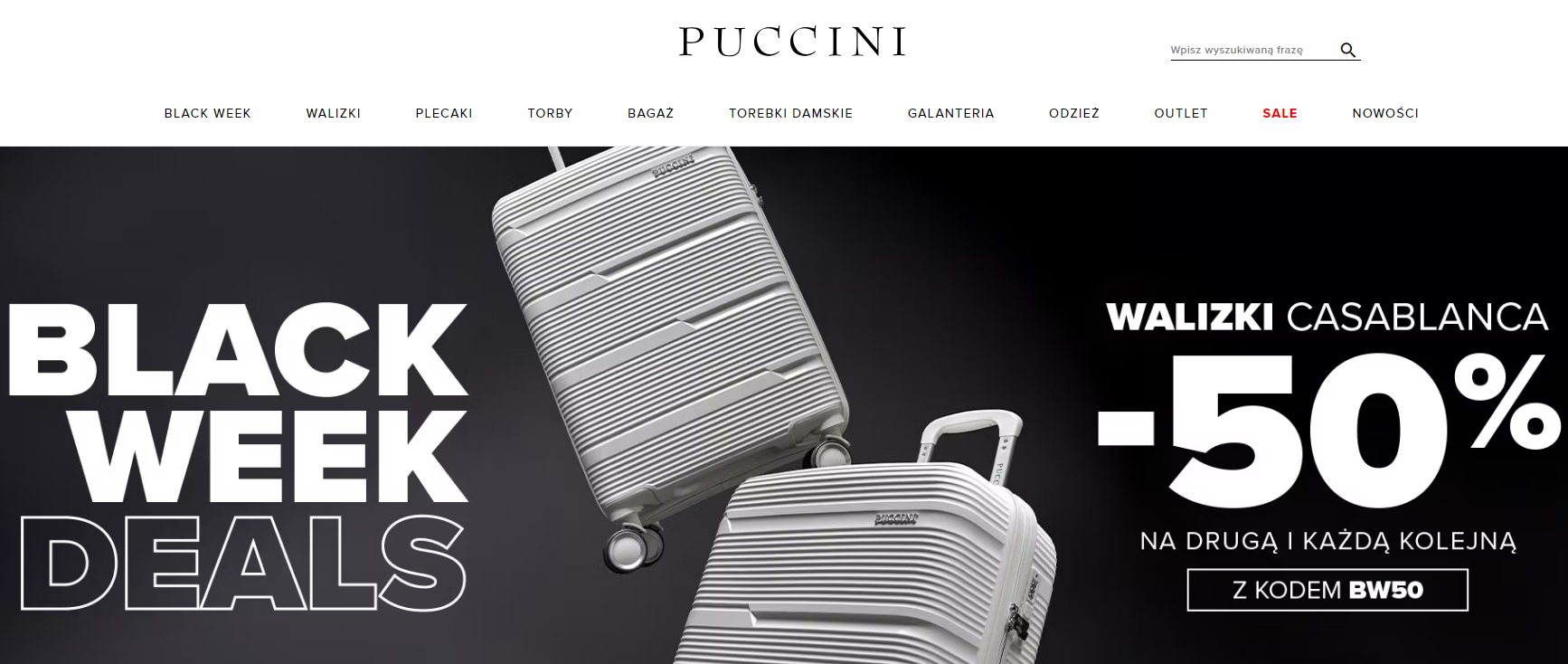 Black Week Deals w sklepie Puccini! Promocja obowiązuje do odwołania lub do wyczerpania zapasów. Sklep Puccini to dobre miejsce dla osób, które cenią eleganckie i trwałe akcesoria, bo oferta jest szeroka, przejrzysta i oparta na produktach wykonanych naprawdę solidnie. Zakupy online są wygodne, a szczegółowe zdjęcia i opisy pomagają łatwo wybrać model dopasowany do stylu i codziennych potrzeb. Warto też korzystać z kodów rabatowych, bo potrafią znacząco obniżyć cenę, szczególnie przy torebkach czy walizkach z wyższej półki, dzięki czemu cały zakup staje się o wiele bardziej opłacalny. To prosty sposób, żeby połączyć estetykę, funkcjonalność i oszczędność, wybierając coś porządnego bez nadmiernego obciążenia budżetu.