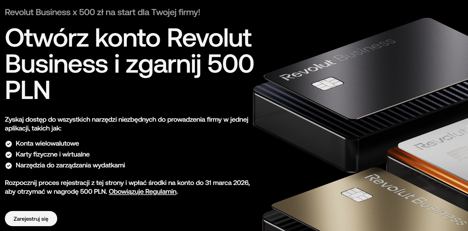Bonus 500 zł na start od Revolut Business dla Twojej firmy. Otwórz konto Revolut Business i zgarnij aż 500 zł. Zyskaj dostęp do wszystkich narzędzi niezbędnych do prowadzenia firmy w jednej aplikacji, takich jak: Konta wielowalutowe, Karty fizyczne i wirtualne, Narzędzia do zarządzania wydatkami. Rozpocznij proces rejestracji z tej strony i wpłać środki na konto do 31 marca 2026, aby otrzymać w nagrodę 500 zł. Oferta dotyczy ona wyłącznie nowych klientów Revolut Business. Zarejestruj się i wpłać pieniądze na konto, aby otrzymać 500 zł. Nagroda zostanie wypłacona na Twoje konto firmowe w ciągu 5 dni roboczych od zakończenia promocji. Obowiązuje Regulamin.