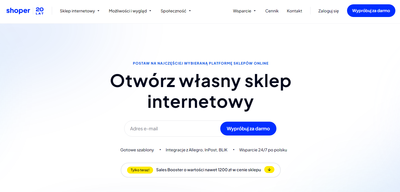 Shoper to nowoczesna, polska platforma do tworzenia i prowadzenia sklepów internetowych. Dzięki niej każdy – niezależnie od wiedzy technicznej – może w kilka minut uruchomić własny sklep online i zacząć sprzedawać w internecie. Całość działa w modelu Software as a Service, co oznacza, że Shoper zapewnia hosting, bezpieczeństwo, aktualizacje i wsparcie techniczne, a użytkownik może w pełni skupić się na sprzedaży. Platforma oferuje intuicyjny panel zarządzania, gotowe szablony graficzne oraz integracje z systemami płatności, firmami kurierskimi i serwisami takimi jak Allegro, Facebook czy Google. To rozwiązanie, które pozwala szybko rozwijać biznes e-commerce bez potrzeby programowania. Shoper cieszy się zaufaniem tysięcy polskich przedsiębiorców, ponieważ łączy łatwość obsługi, stabilność działania i profesjonalne wsparcie techniczne. To jedna z najczęściej wybieranych platform e-commerce w Polsce – idealna dla osób, które chcą rozpocząć sprzedaż online lub rozwinąć już istniejący sklep internetowy.