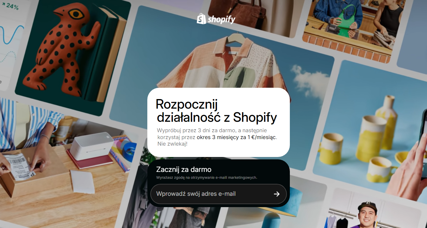 Rozpocznij działalność z Shopify już teraz! Wypróbuj przez 3 dni za darmo, a następnie korzystaj przez okres 3 miesięcy za 1€/miesiąc. Nie zwlekaj! Shopify...