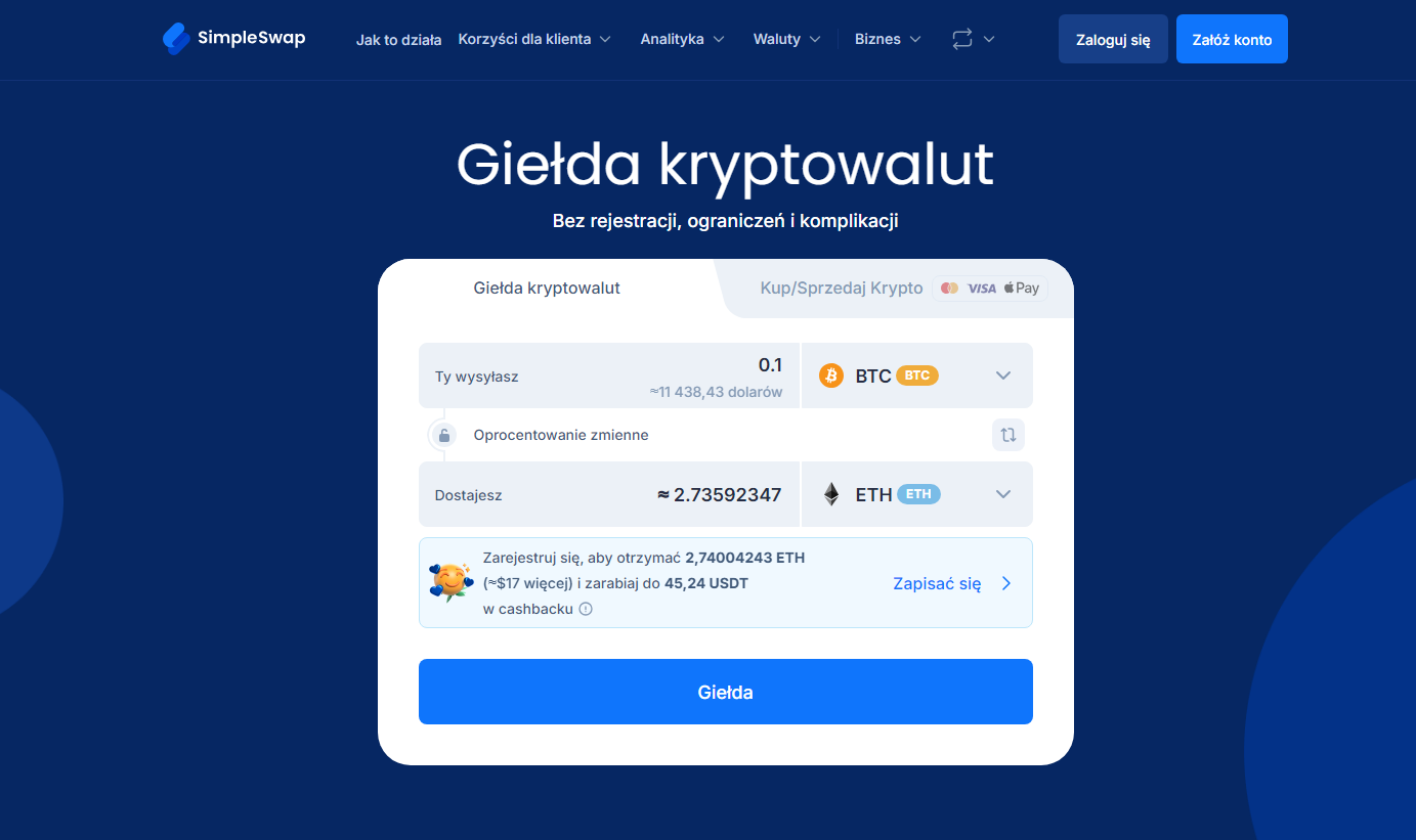 SimpleSwap to szybka i wygodna platforma do wymiany kryptowalut, która nie wymaga zakładania konta ani skomplikowanej weryfikacji. Oferuje bardzo szeroki wybór coinów, przejrzysty interfejs i natychmiastową realizację transakcji. Użytkownicy chwalą ją za bezpieczeństwo, brak ukrytych opłat i profesjonalne wsparcie działające 24/7. Idealne rozwiązanie, gdy chcesz sprawnie wymienić krypto bez zbędnych formalności!