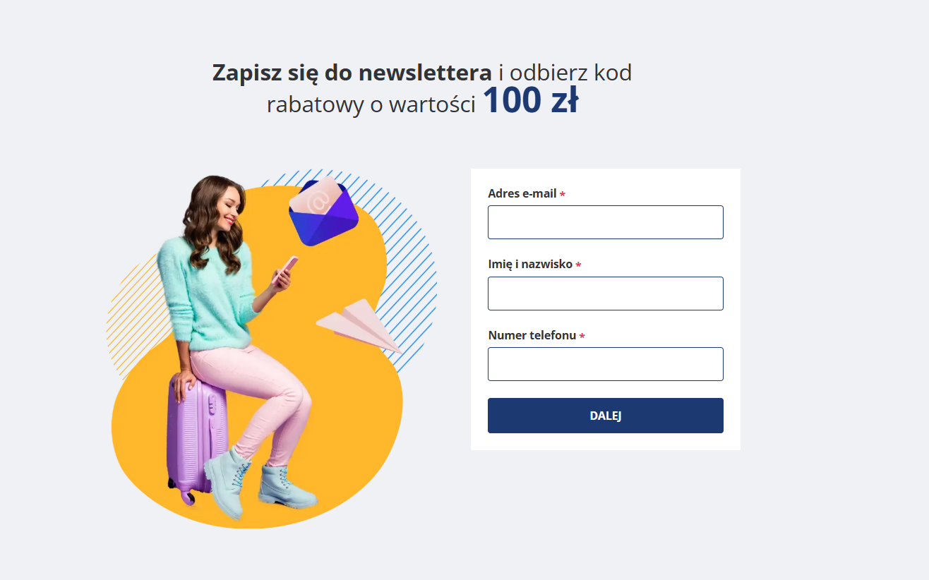 Kod na 100 zł rabatu otrzymasz po zapisaniu się na newsletter Sun&Snow. Zapis do newslettera Sun & Snow to prosty sposób na realną oszczędność już przy pierwszej rezerwacji. Po zapisaniu się do bazy mailingowej otrzymasz kod rabatowy o wartości 100 zł, który możesz wykorzystać na noclegi w ofercie Sun & Snow. Dzięki temu obniżysz koszt swojego wyjazdu, a jednocześnie zyskasz dostęp do informacji o aktualnych promocjach, ofertach specjalnych oraz inspiracjach podróżniczych. Newsletter pozwala być na bieżąco z najlepszymi okazjami, dzięki czemu łatwiej zaplanować wypoczynek w atrakcyjnej cenie i w sprawdzonych lokalizacjach.
