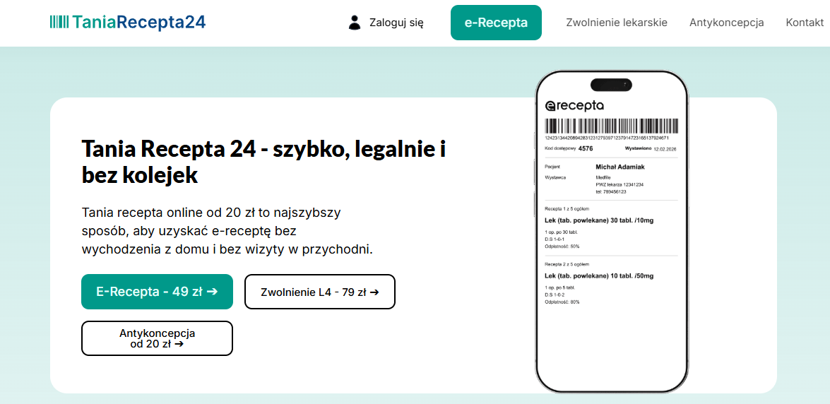 Czy recepta online jest legalna? Tak. Recepta online jest w pełni legalna i zgodna z polskim prawem, pod warunkiem że została wystawiona przez lekarza posiadającego aktualne prawo wykonywania zawodu. Na taniarecepta24.pl: - każda e-recepta wystawiana jest po analizie formularza medycznego - lekarz podejmuje decyzję zgodnie z aktualną wiedzą medyczną - w razie potrzeby kontaktuje się z pacjentem telefonicznie lub przez czat - cały proces spełnia wymogi RODO oraz telemedycyny - Twoje dane medyczne są chronione, a wystawiona recepta online ma taką samą moc prawną, jak recepta otrzymana podczas wizyty stacjonarnej. Możesz ją zrealizować w każdej aptece – bez ograniczeń i bez dodatkowych formalności.