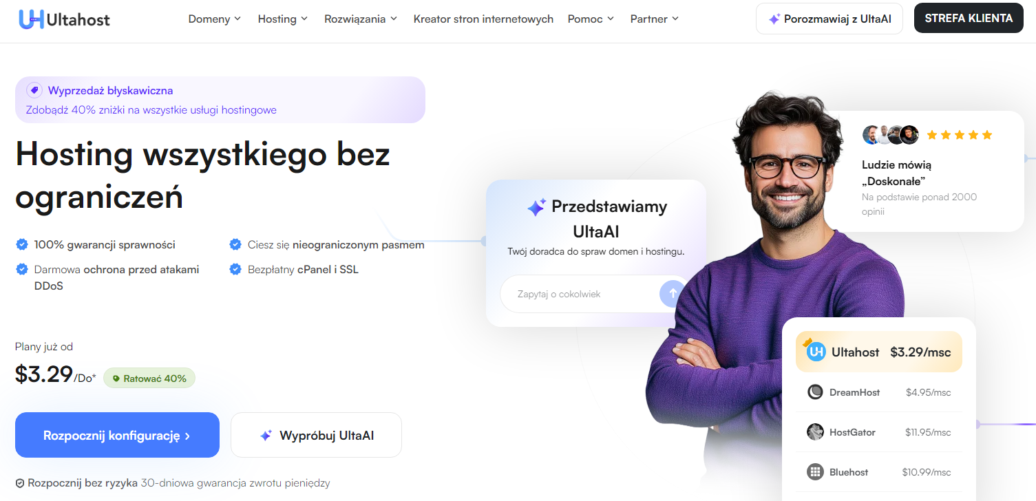 Ultahost to szybki i niezawodny dostawca hostingu, który oferuje wszystko — od prostych stron po zaawansowane serwery VPS i dedykowane. Wyróżnia się nowoczesną infrastrukturą SSD/NVMe, świetnym wsparciem technicznym 24/7 i intuicyjnym panelem zarządzania. Użytkownicy chwalą Ultahost za wysoką wydajność, bezpieczeństwo danych i elastyczne ceny, dzięki czemu jest to idealny wybór zarówno dla firm, jak i indywidualnych twórców szukających solidnego hostingu.