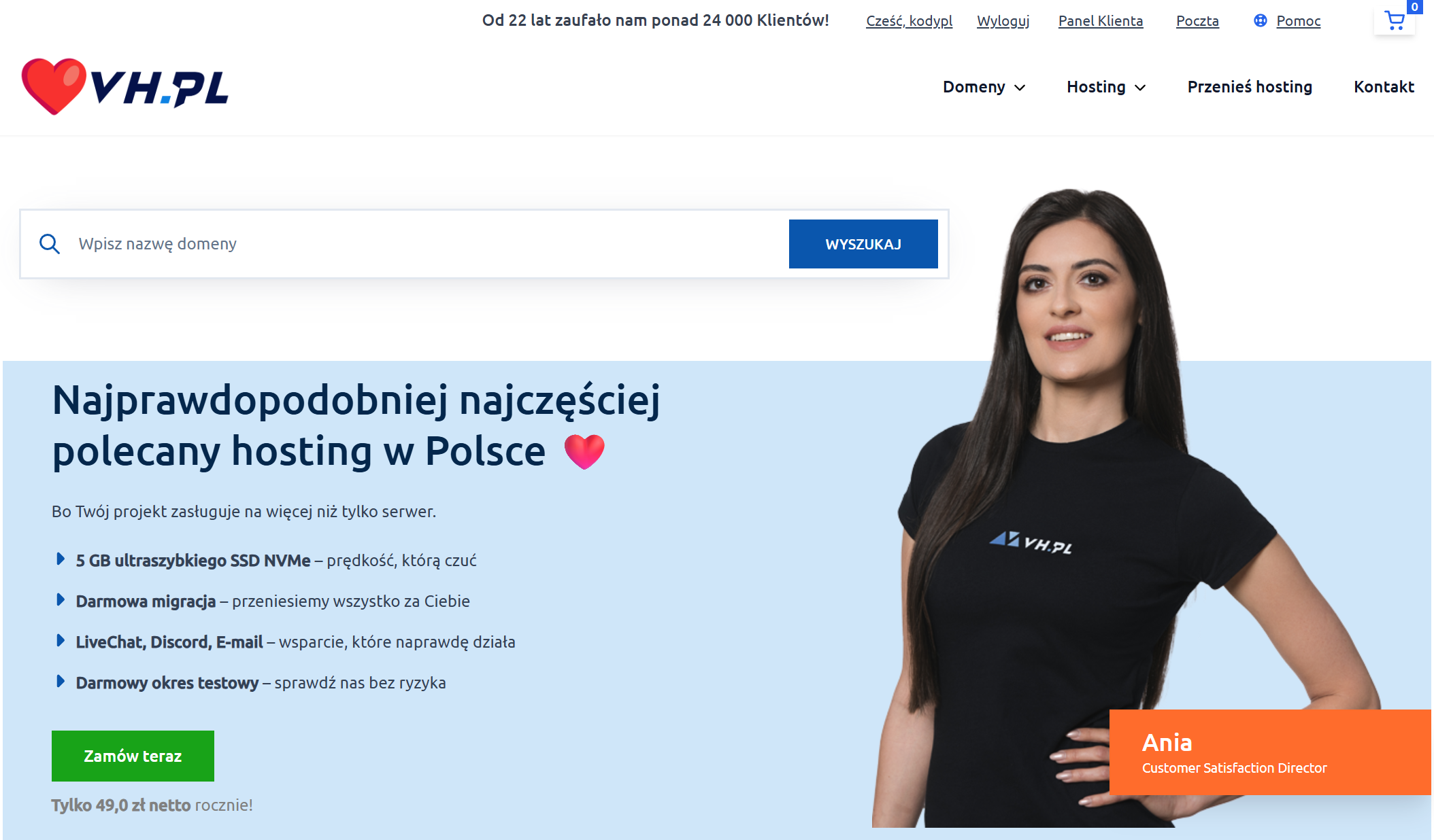 VH.PL powstało jako odpowiedź na brak odpowiedniego dostawcy usług hostingowych i rejestracji domen, który na prostych zasadach jest w stanie świadczyć swoje usługi. W naszej firmie nie ma miejsca na niedomówienia, a na pierwszym miejscu stawiamy partnerskie i przejrzyste relacje z każdym Klientem.