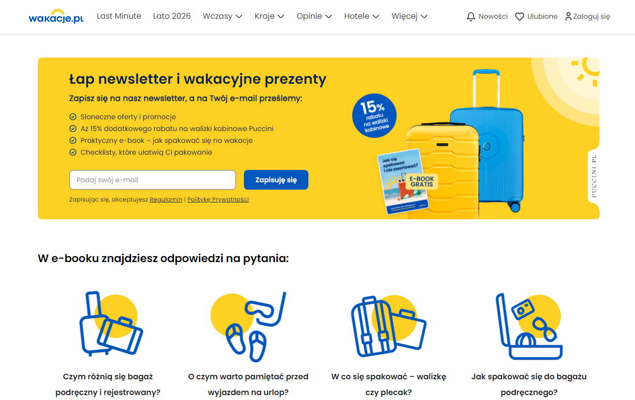 Kod rabatowy na walizkę kabinową od Puccini oraz praktyczny e-book przygotowany specjalnie z myślą o osobach planujących wyjazd. Kod udostępniony na portalu umożliwia uzyskanie atrakcyjnego rabatu na produkty z kategorii walizek kabinowych, naliczanego od ich bieżącej ceny. Oferta nie łączy się z innymi promocjami i nie obejmuje zakupów w salonach stacjonarnych, co sprawia, że jest to szczególnie korzystna propozycja dla osób zamawiających online. E-book dołączony do promocji to przemyślany zestaw porad, dzięki którym każdy może szybko podnieść swoje umiejętności pakowania. Zawiera konkretne wskazówki, informacje niezbędne przed wyjazdem oraz gotowe listy rzeczy, które ułatwiają przygotowanie plecaka lub walizki na wakacje. Materiał został opracowany tak, aby nawet osoby pakujące się na ostatnią chwilę mogły zrobić to sprawniej, szybciej i bez stresu. Całość tworzy atrakcyjny pakiet, który warto pobrać, bo łączy realną oszczędność z praktyczną wiedzą przydatną podczas każdego wyjazdu. Użytkownicy, którzy sięgną po kod rabatowy i e-book, mogą liczyć na wygodniejsze przygotowania do wakacji z Wakacje.pl.